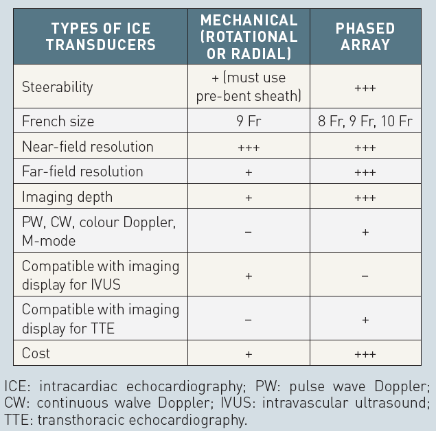 [(A) Image provided courtesy of Boston Scientific. \u00a9 2011 Boston Scientific Corporation or its affiliates. All rights reserved. (B) From reference 16, Figure 3.3 page 21. Reprinted with permission from Taylor & Francis]","mediaType":"image","mediaMimeType":"image\/png","mediaPPT":"PCR_Textbook_Chapter-INTRACARDIAC-ECHOCARDIOGRAPHY_FIGURE-1.pptx"})' class="cursor-pointer">Figure 1). The transducer is housed in a 1 cm long sheath and sterile water is introduced into the catheter to optimise imaging. The piezoelectric crystal rotates through the sector at a high sweep speed to generate the image. The catheter is inserted over-the-wire through precurved Convoy™ introducer sheaths (Boston Scientific, Natick, MA, USA) that are bent at 15° to 140° curves. One sheath may be exchanged for another if a different view is needed. The catheter can be used with a freestanding, portable display cart or the fully integrated iLab™ Ultrasound Imaging System (Boston Scientific, Natick, MA, USA), which displays images on a screen above the table. Mechanical transducers have high resolution in the near-field, are good for basic views, and are conveniently compatible with equipment used for IVUS, but do not offer spectral or colour Doppler imaging, have a limited imaging depth, and are stiffer due to the rotational core.